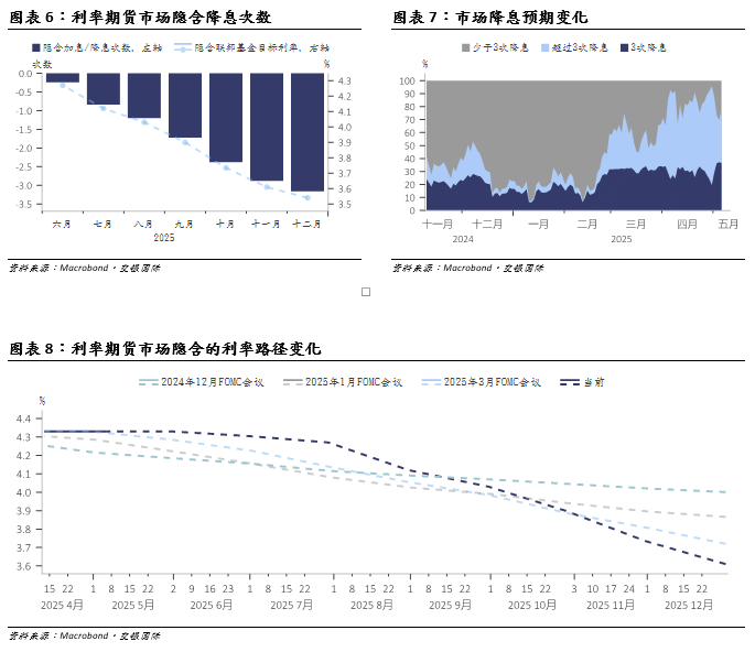 美联储此次会议后,市场对降息路径的预期出现明显调整。市场预期美联储首次降息的时点已由6月推迟至7月,全年降息预测仍维持在3次附近。我们认为当前美联储的等待是合理的:一方面,关税影响可能逐渐在未来两个月体现,比如价格压力的传导,以及对港口、运输等行业的就业冲击。另一方面,“对等关税”暂停90天可能要到7月份,在此之前很难看到明朗的关税形势,而截至目前也尚未出现任何达成关税协议的范例。基准情形下,美元信用风险,尤其是美债市场的走势已成为特朗普“软肋”,后续关税力度仍有较大概率放缓,若关税冲击对通胀、就业影响有限,则全年降息仍有可能在1-2次,而首次降息可能将推迟到4季度。